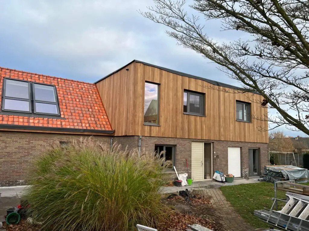 BJ Concept realiseerde in Kruisem een prachtige extra verdieping op een bestaande woning. De werkzaamheden omvatten de afbraak van het bestaande dak, het plaatsen van een ringbalk met nieuwe tussenvloer, het plaatsen van een extra verdieping in houtskeletbouw met plat dak, de vernieuwing van de structuur van het hellend dak, het plaatsen van 2 Velux Cabrio dakramen, de afwerking van de buitenzijde met thermo fraké planchetten en de binnenzijde is schilderklaar afgewerkt.
