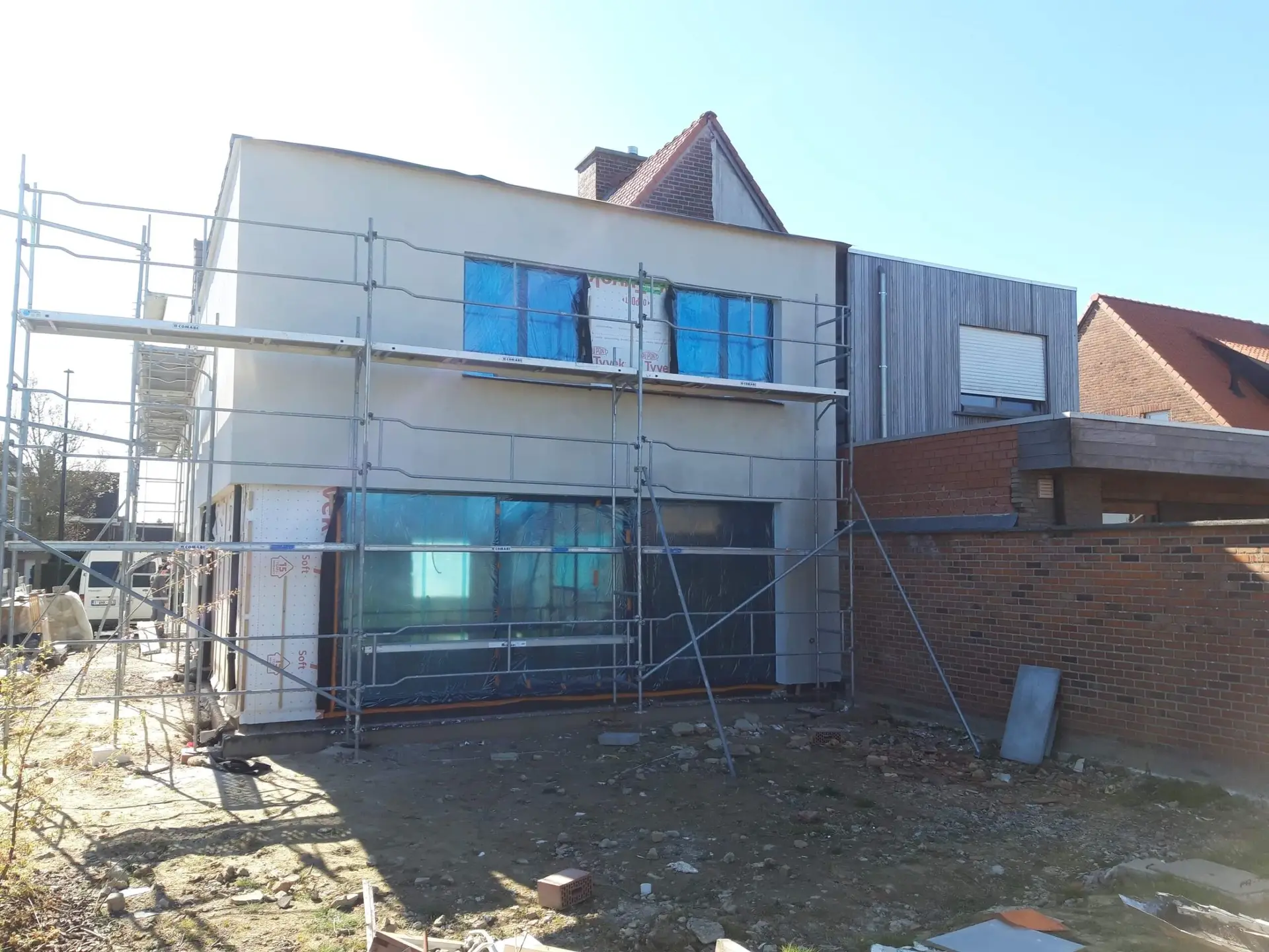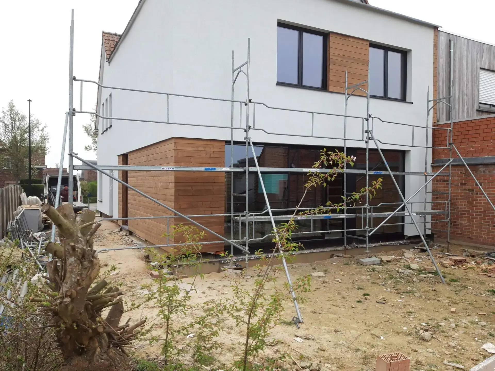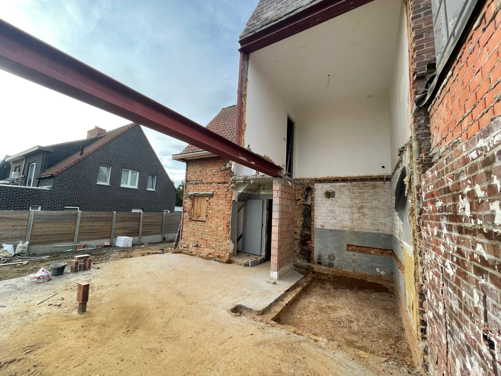 Eerst werden de afbraakwerken en de werken in de bestaande woning aangepakt.