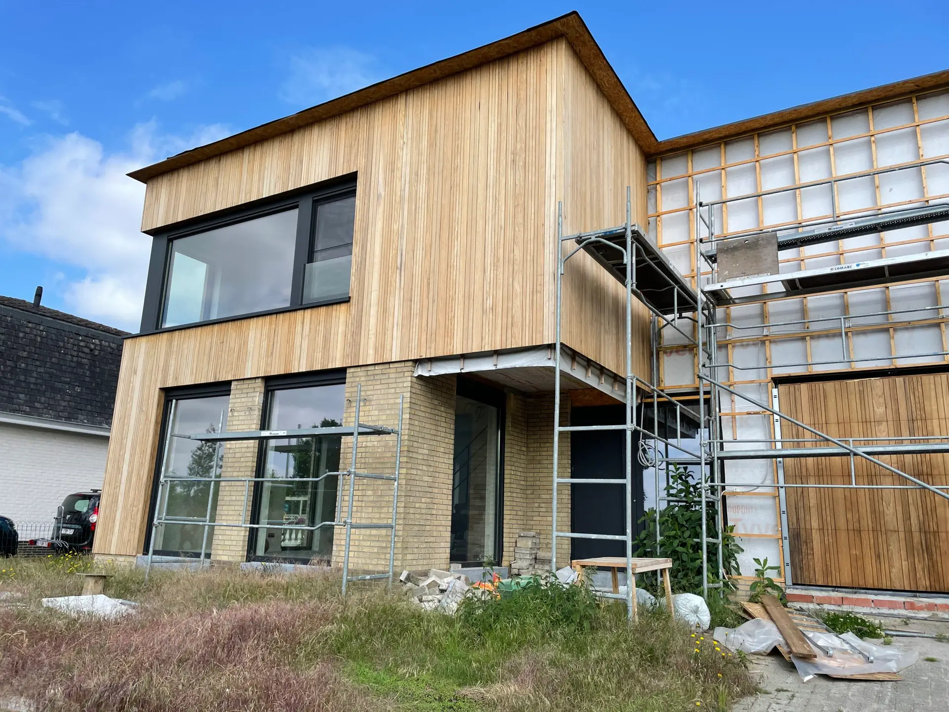 De bestaande gevelsteen van de woning werd deels behouden en werd afgewerkt met kalei. De overige gevels werden afgewerkt met thermo fraké variozone planchetten.